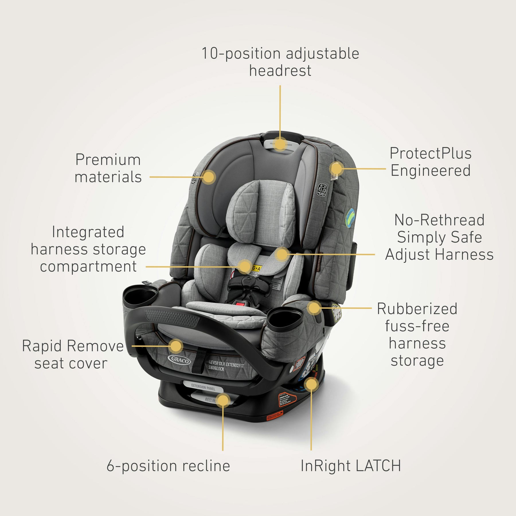 The Graco® Premier Midtown™ collection is tailored with premium materials and design. The Graco® Premier 4Ever® DLX Extend2Fit® SnugLock® 4-in-1 Car Seat featuring Anti-Rebound Bar gives you 10 years of use with one car seat, and installs in less than one minute with SnugLock® Technology. The 4-in-1 car seat transitions from a rear-facing harness (4-50 lb) to forward-facing harness (26.5-65 lb) to highback belt-positioning booster (40-100 lb) to backless booster (40-120 lb). The anti-rebound bar provides an additional layer of rear-facing safety by limiting rotation of the seat and your child in the event of an impact. The Extend2Fit® 4-position extension panel provides up to 5” of extra rear-facing legroom, allowing your child to safely ride rear-facing longer, up to 50 lb. The car seat is Graco® ProtectPlus Engineered™ to help protect your child in frontal, side, rear, and rollover crashes.