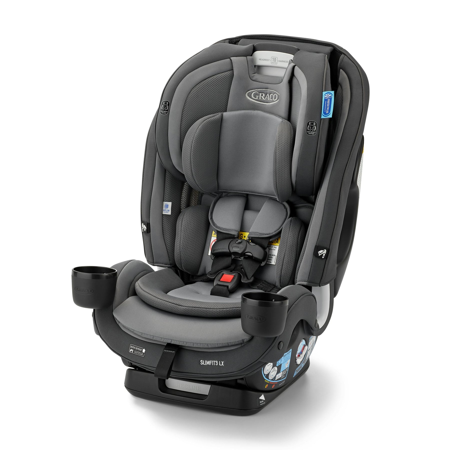 The Graco® SlimFit3™ LX 3-in-1 Car Seat is our slimmest design that fits 3 car seats across, saving space in your back seat without compromising on the safety you trust and the features you need. This narrow all-in-one car seat grows with your child from rear-facing harness (5-40 lb) to forward-facing harness (26.5-65 lb) to highback booster (40-100 lb). We tested our lightweight 3-across car seat in every configuration, to help ensure your growing family can fit in your vehicle, even with children of different ages who ride in different modes, or when paired with select other Graco car seats. Integrated belt lock-off makes for easy vehicle seat belt installation in forward-facing mode, and allows you to position your seats to maximize space with 3 across. Graco’s exclusive push-button InRight™ LATCH provides an easy, one-second attachment with an audible click to help ensure secure installation. We made thoughtful design choices to make the SlimFit3 easy to adjust with 3 car seats in the back seat. The No-Rethread Simply Safe Adjust™ Harness System allows you to adjust the height of the headrest and harness to 10 positions with just one motion for just the right fit. Easily adjust the 4-position recline for a better installation and a comfortable ride. The Rapid Remove cover comes off in 60 seconds, without uninstalling the seat or removing the harness, and is machine washable. Plus, the SlimFit3™ is slim enough to fit 3 across, but spacious enough to keep your growing child comfy. Breathable mesh AirFlow channels provide improved ventilation to keep your child cool and comfortable. Two cup holders are designed to work with the three-across configuration to keep drinks and snacks close at hand. Fuss-free harness storage pockets conveniently hold the harness out of the way while your child gets in and out. Removable, plush head and body inserts help to keep your infant feeling cradled and comfortable. The steel-reinforced frame provides strength and durability for years of use, and EPS energy-absorbing foam provides effective impact energy management. This car seat is Graco® ProtectPlus Engineered® to help protect in frontal, side, rear, and rollover crashes.